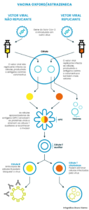 No caso da AstraZeneca/Oxford, a plataforma utilizada foi a de vetor viral não replicante. Para isso, foi usado um adenovírus, editado geneticamente e no qual foi incluída a proteína Spike do coronavírus. Dessa forma, um antígeno (proteína) vai estimular o sistema imunológico do indivíduo a produzir anticorpos contra o vírus que causa a Covid-19.