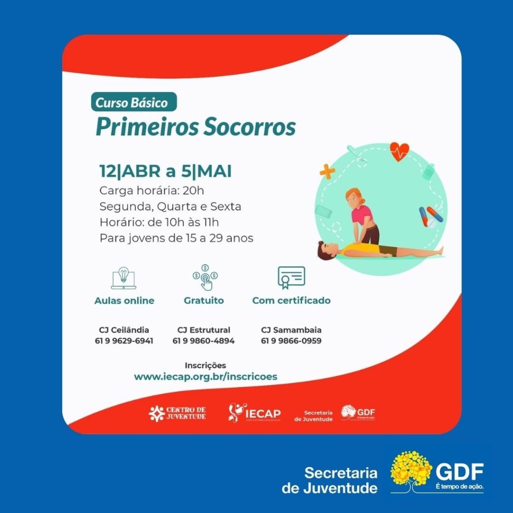 Com carga horária de 20 horas e duração de dez dias, o Curso Básico de Primeiros Socorros promovido pelo Centro de Juventude (CJ), da Secretaria de Juventude (Sejuv), tem inscrições abertas a todos os interessados. As aulas, ministradas pela plataforma Zoom, terão início na segunda-feira (12), às 10h.