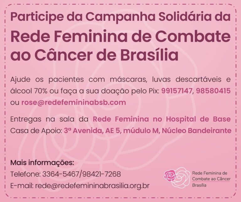 Frascos de álcool gel, luvas e máscaras descartáveis podem ser entregues na sede da Rede Feminina no HB ou na Casa de Apoio (3ª Avenida, AE 5, Módulo M, Núcleo Bandeirante). Os telefones de contato são o 3364-5467 e o 98421-7268. As doações também podem ser feitas por dinheiro. “Qualquer valor é bem-vindo”, destaca a coordenadora da rede.