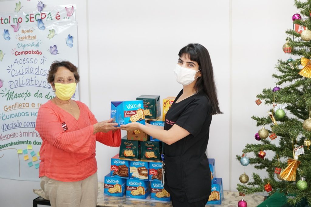 A ação foi possível graças à ajuda do grupo de voluntários Policial Noel, parceiros da unidade de cuidados paliativos desde 2019. “No ano passado, eles nos ajudaram na nossa confraternização natalina, com doação de presentes para as crianças e de panetones para as famílias. Desta vez, devido à pandemia, decidimos manter apenas os panetones”, acrescentou Flávia.