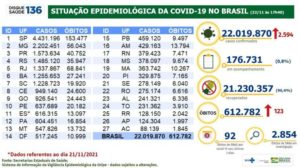 O Ministério da Saúde divulgou hoje (22) novos números sobre a pandemia de covid-19 no país. De acordo com levantamento diário feito pela pasta, o Brasil acumula desde o início da pandemia 22 milhões casos confirmados da doença e 612,7 mil mortes registradas.