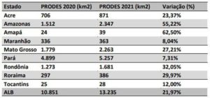 O Instituto Nacional de Pesquisas Espaciais (Inpe) divulgou nesta quinta-feira (18) que a taxa de desmatamento na Amazônia Legal Brasileira (ALB) ficou em 13.235 quilômetros quadrados (km²) no período de 01 agosto de 2020 a 31 julho de 2021. O índice apurado pelo Projeto de Monitoramento do Desmatamento na Amazônia Legal por Satélite (Prodes) representa um aumento de 21,97% em relação à taxa de desmatamento do período anterior.