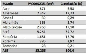 Conforme os dados do Inpe, os estados do Pará, Amazonas, Mato Grosso e Rondônia correspondem a 87,25% do desmatamento estimado na Amazônia Legal, sendo o Pará o estado com maior contribuição absoluta de desmatamento (5.257 km2) e também o estado com menor variação percentual de desmatamento (7,31%).