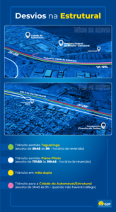 Quem quiser ir em direção à Cidade do Automóvel, continua na própria pista norte. Antes de entrar na Estrutural haverá uma bifurcação com um painel de mensagem variável orientando os condutores. A pista marginal paralela à Cidade do Automóvel ficará operando apenas no sentido Plano Piloto – Taguatinga sem a atual mão dupla. O trânsito no sentido Taguatinga – Plano Piloto permanece da forma como está hoje, sem alterações.