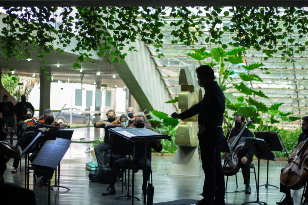 Os músicos da Orquestra Sinfônica do Teatro Nacional Claudio Santoro (OSTNCS) celebram o retorno parcial das atividades presenciais. Desde a última sexta-feira (19), o foyer da Sala Villa-Lobos, um dos destaques do teatro, virou palco de ensaios dos concertos para a nova temporada. Ao som de cordas de violinos, violas, violoncelos e contrabaixos, os musicistas iniciaram o trabalho para gravar concertos inéditos que serão transmitidos no canal da OSTNCS no YouTube.